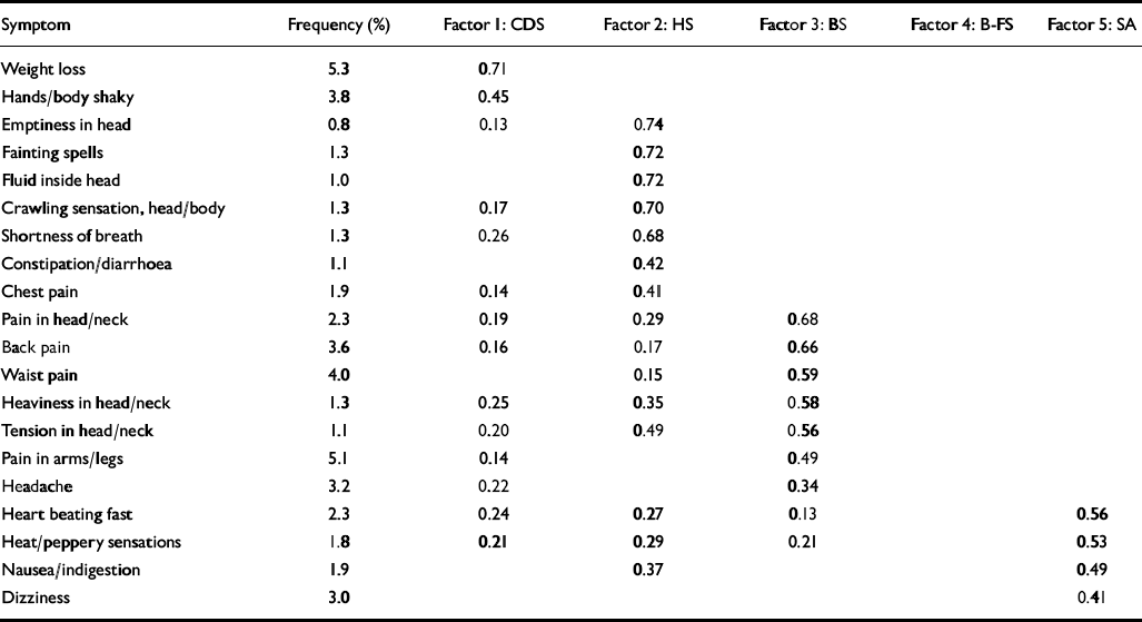 | Symptom | Frequency (%) | Factor 1: CDS | Factor 2: HS | Factor 3: BS | Factor 4: B-FS | Factor 5: SA |