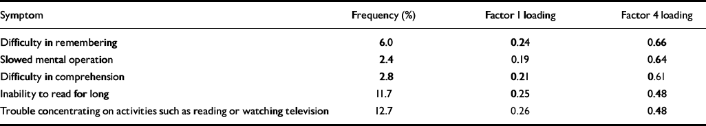 Table 3 Cognitive symptom loadings on factors 1 and 4 (n=829)