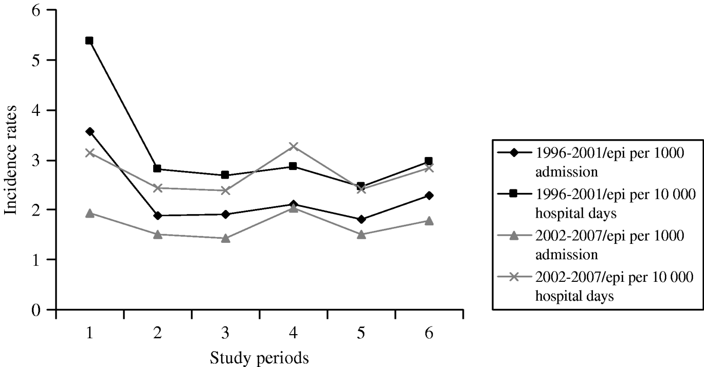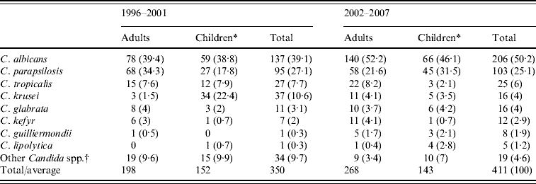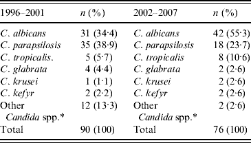 Table 3 details the species distribution of candidaemia in the adult ICUs; 36% of all episodes occurred in adult patients (166/457) hospitalized in the medical and surgical ICUs. C. parapsilosis was the most common species in these patients with an approximate rate of 40% in the first period, whereas in the second period, C. albicans was the most common aetiological agent. Thus, C. albicans increased by 20·9% (P=0·003) during 2002–2007 compared to 1996–2001, whereas C. parapsilosis decreased by 15·2% (P=0·0015).