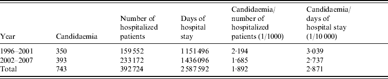 Surveys performed at a single hospital have tremendous value for therapeutic decision-making and prevention measures at the local level. As only a single report documenting the incidence and spectrum of organisms responsible for candidaemia in a Turkish hospital has been published [Reference Yapar16], we performed a hospital-wide survey that included all hospital units. Although this study was restricted to a single hospital, a large sample size (2·5 million patient-days) was attained. The incidence of candidaemia (1·9/1000 patients and 2·9/10 000 patient-days) in our centre is higher than the rates reported from centres in the USA and other European countries, including the above-mentioned report from our country [Reference Wisplinghoff4, Reference Tortorano6, Reference Pfaller and Diekema15, Reference Yapar16]. Morgan [Reference Morgan17] cites the incidence of candidaemia from different countries to be between 0·2 and 2·8/1000 admissions and 0·3 and 1·14/10 000 patient-days. The incidence rates most similar to those found here (above 1·5/10 000 patient-days) have been reported from Italy, Spain, Belgium, Brazil, and Taiwan [Reference Tortorano6, Reference Almirante18–Reference Chen21]. It is well documented that the frequency of isolation of Candida spp. varies widely in different countries and hospitals. Numerous factors contribute to this such as differences in patient demographics and comorbidities, as well as medical practices, especially the use of long-term vascular catheters and antibacterial and antifungal prescribing patterns. We speculate that the high incidence of candidaemia in our tertiary-care teaching hospital of 800 beds is probably due to the large patient population at risk for infection. The surveillance system (NNIS) in the USA showed a clear association between the incidence of candidaemia and the number of hospital beds and/or the academic affiliation [Reference Banerjee22] and corroborated the European Confederation of Medical Mycology survey [Reference Tortorano6].