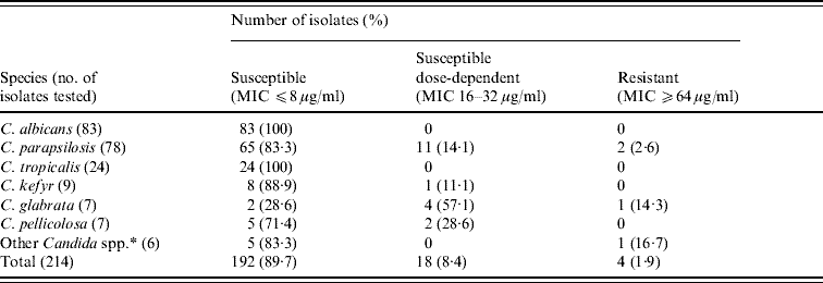 The MICs for the two control organisms tested by the reference method in all the sets of experiments consistently agreed with those from the CLSI reference results, confirming both the reproducibility of the results and the correct drug concentrations. The fluconazole susceptibility of the 214 Candida spp. isolates tested is presented in Table 4; the overall resistance rate was 1·9% (MIC ⩾64 μg/ml). All C. albicans and C. tropicalis isolates were susceptible to fluconazole (MIC ⩽8 μg/ml) whereas 2·6% and 14·3% of C. parapsilosis and C. glabrata isolates, respectively, were resistant. Reduced susceptibilities (16–32 μg/ml) were obtained in some C. parapsilosis, C. glabrata, C. kefyr and C. pelliculosa isolates. No significant changes in susceptibility to fluconazole were seen over time in the C. albicans, C. parapsilosis and C. tropicalis strains tested between 1996 and 2007 (data not shown). Due to the limited number of isolates, similar comparisons with other Candida spp. were not calculable.
