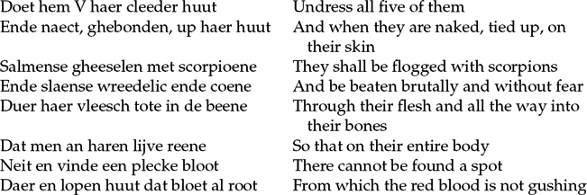 Their unity was also clear when the martyrs-masons spoke. Claudijn told Simplicius ‘I teach you’ but refers to ‘our tool’, to ‘our prayers’, and persuaded him to be baptized to ‘our rule’. When ordered to make a sacrifice, Claudijn told Diocletian that ‘we want to follow your command, but we do not wish to make an offering’ and further that to worship what ‘we make with our hands’ would be a disgrace and ‘we would rather die’. Later, Castorijn declared ‘we wish to acknowledge that we work in His name’, almost always speaking in the third person plural. Masonic unity is in contrast to Diocletian. He declared ‘I shall have made a temple of fine size’ and wished to have an idol ‘in my fine temple’, and he makes no reference to the good of his people, or other users of the temple. It is tempting to compare Roman tyrant(s) to the rulers of Ghent, Philip the Good in the 1420s and Charles V in the 1520s. Philip's relationship with Ghent was far from harmonious; as he became more powerful, he tried to extract more from his largest town often at the expense of civic liberties. Charles V, who had been count of Flanders since the death of his father in 1506 and was elected Holy Roman Emperor in 1519, had a similarly volatile relationship with the city of his birth. It is difficult to link anything specific in the description of Nero or Diocletian to Philip or Charles, but in Ghent the trope of a bad autocratic emperor was always going to be popular, and a clear antithesis to the united mutually supportive martyrs.