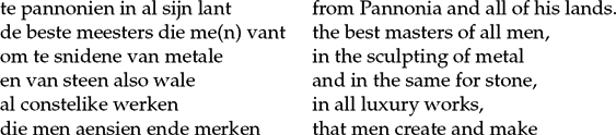 In searching for the best masters in all works, he finds Claudijn, Castorijn, Nicostraet and Symphoriaen, who were skilled in the working of