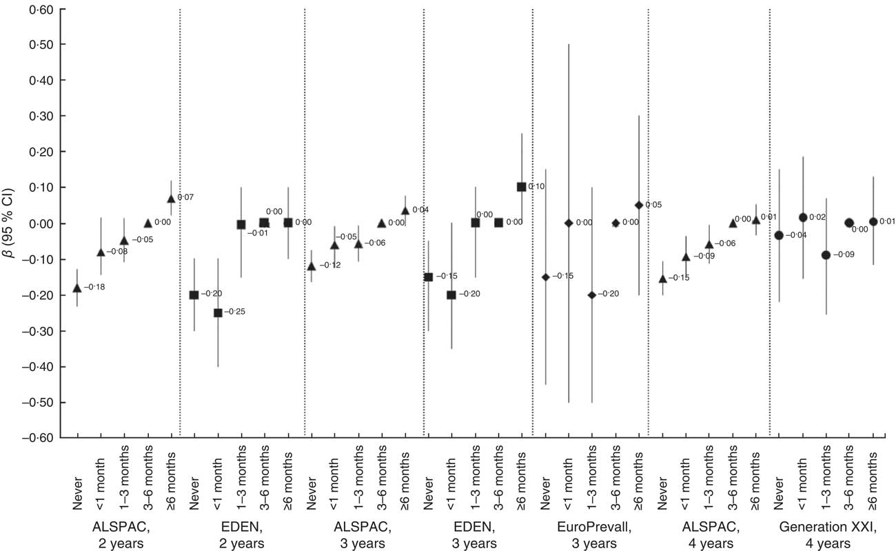 Being breast-fed for a shorter duration was associated with lower HPVS scores in the EDEN and ALSPAC cohorts in adjusted models at all ages (see Fig. 1). In the Generation XXI cohort a similar association with never being breast-fed (β=−0·09, 95 % CI −0·15, −0·02) and being breast-fed for <1 month (β=−0·10, 95 % CI −0·17, −0·04) did not persist after complementary feeding was added to the model (β=−0·35, 95 % CI −0·22, 0·15 and β=−0·02, 95 % CI −0·16, 0·19, respectively). In the EuroPrevall cohort there was a similar trend towards a lower variety score (β=−0·15, 95 % CI −0·4, 0·15) in the non-breast-fed children compared with children breast-fed for 3–6 months. In the ALSPAC and EDEN cohorts, infants who never breast-fed had a lower HPVS than those who breast-fed for 3–6 months that was independent of maternal HPVS in pregnancy (β=−0·16, 95 % CI −0·21, −0·11, β=−0·098, 95 % CI −0·14, −0·06 and β=−0·14, 95 % CI −0·18, −0·09, in the ALSPAC cohort at 2 years, 3 years and 4 years, respectively; β=−0·20, 95 % CI −0·3, −0·10 and β=−0·10, 95 % CI −0·25, 0·00 in the EDEN cohort at 2 years and 3 years, respectively). There were fairly similar effect sizes in the ALSPAC cohort when maternal HPVS score at 47 months was used in place of diet in pregnancy (β=−0·14, 95 % CI −0·2, −0·09, β=−0·08, 95 % CI −0·12, −0·03 and β=−0·11, 95 % CI −0·16, −0·06 at 2 years, 3 years and 4 years, respectively).