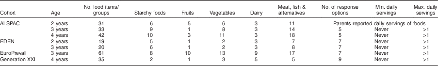 Dietary information was collected via parental-completion FFQ for each of the cohorts at various time points ranging from 2 to 4 years of age. Each cohort used its own FFQ, which varied in the number of items and frequency categories investigated. The ALSPAC children’s FFQ was a modified version of the mother’s FFQ that was based on an FFQ developed by Yarnell et al. The FFQ administered when the children were 38 months old has been compared with 3 d diet diaries collected in a sub-sample of children at 41 months; the results were very similar. The Generation XXI FFQ has thirty-five items. In a sub-sample of approximately 2500 children, 3 d food records were also completed and compared with the FFQ data. Pearson’s coefficients showed weak to moderate positive correlations for most food groups. The EDEN FFQ for children was a modified shortened version of the mothers’ validated FFQ. The EuroPrevall FFQ was based on the FFQ that was designed to record food intake among pre-school children in Greece and other European countries as part of the ToyBox project of the European Commission’s Seventh Framework Programme.