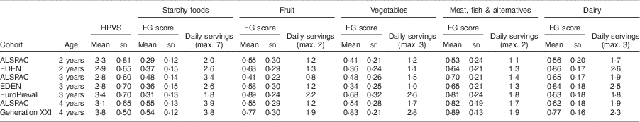 Maternal diet was assessed by FFQ in two of the cohorts. In the EDEN cohort maternal diet was assessed in late pregnancy; in the ALSPAC cohort it was assessed in late pregnancy and when the child was 4 years old. These FFQ data were used to calculate the maternal HPVS in the same way as described above. Maternal diet data were available in the Generation XXI cohort, but there were insufficient food items to calculate the HPVS.
