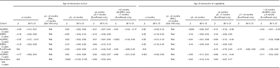 Across all cohorts there were no independent associations between the age the infant started complementary feeding and the HPVS in fully adjusted models (data not shown). In the ALSPAC cohort only, later introduction to vegetables (≥6 months) was associated with a lower variety score compared with introduction to vegetables between 4 and 5 months. Those introduced later had a lower HPVS (see Table 4). On additional adjustment for maternal HPVS the associations remained although slightly attenuated. There was some evidence that later introduction to fruit was related to lower variety score in the ALSPAC and EDEN cohorts at 2 years (see Table 4), but these associations were not observed at any other age nor in the other two cohorts.
