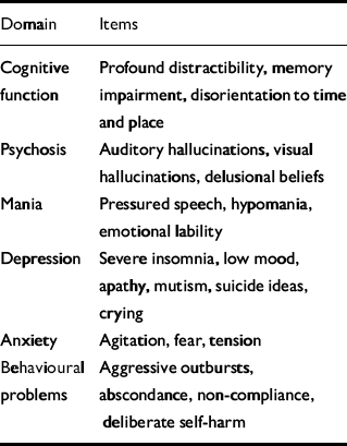 For telephone interviews, a neuropsychiatric symptom checklist including six domains and 22 items (Table 1) was employed for screening purposes. The design of the checklist was based on existing knowledge pertaining to steroid-induced psychiatric problems (Reference SiroisSirois, 2003) and common stress responses in traumatic illnesses.