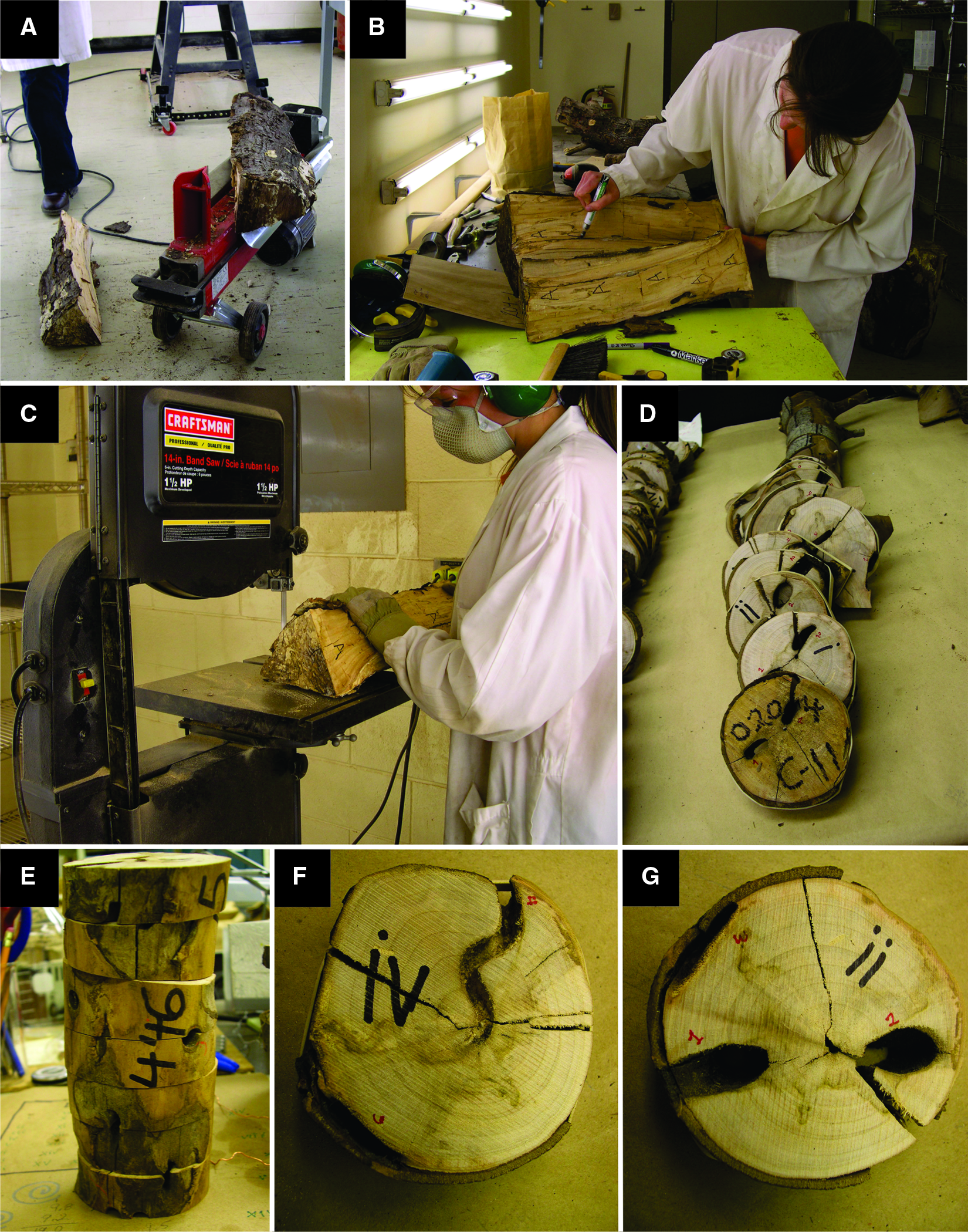 Fig. 19. Part of the Canadian Food Inspection Agency survey quality assurance programme. A, A forest health specialist marks B, simulated signs of Anoplophora glabripennis oviposition (pits) and C, emergence (holes), without the knowledge of inspectors conducting operational visual surveys from the ground or by climbing trees.
