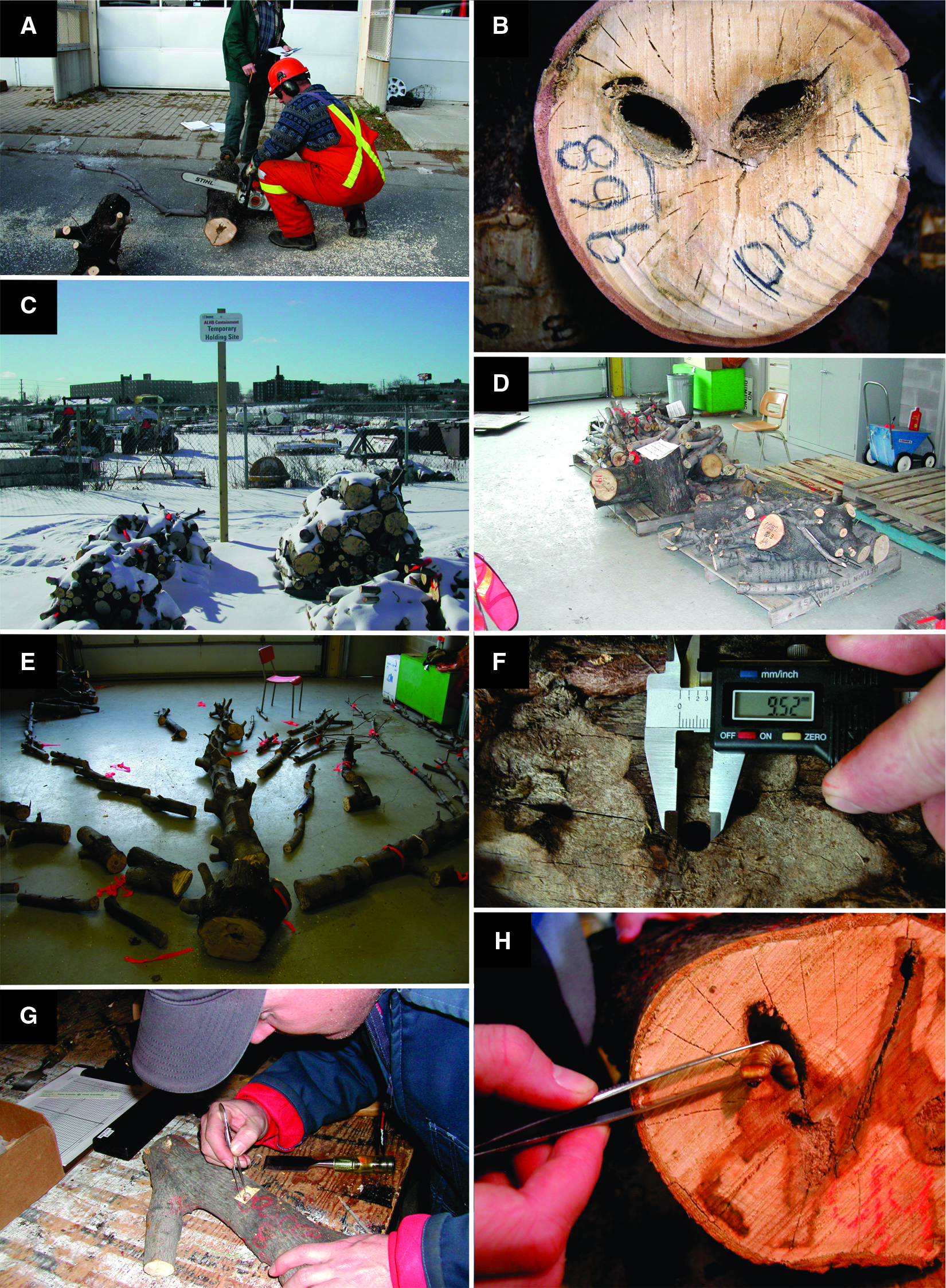 The International Plant Protection Convention and the international standards for phytosanitary measures define an infestation (of a commodity) as the presence in a commodity of a living pest of the plant or plant product concerned (Food and Agriculture Organisation of the United Nations 2018a). At this early stage of the emergency response, it had not always been possible to determine if all trees with signs or symptoms of A. glabripennis injury contained live specimens. The CFIA therefore standardised the terminology used by referring to standing trees with signs and symptoms of injury that resembled those of A. glabripennis as “trees of interest.” When such a tree was found, the inspector contacted the supervisor, who re-examined a sample (see section, Stem assessment: infestation status and injury description, below, for details) to confirm or reject the tree’s field injury status. Samples were re-examined in greater detail later within a containment facility to determine their infestation status. After comparison with voucher specimens, trees containing a live specimen of A. glabripennis were deemed “infested.” Those with only dead specimens were classified as “attacked.” Those with only signs or symptoms characteristic of A. glabripennis injury were labelled “suspect.” Trees in any of these three status groups were referred to as “affected.” All other trees were deemed “unaffected.” This terminology differed slightly from that used in the United States of America, where a host tree was considered infested when it presented any sign of A. glabripennis activity or damage (United States Department of Agriculture 2014).