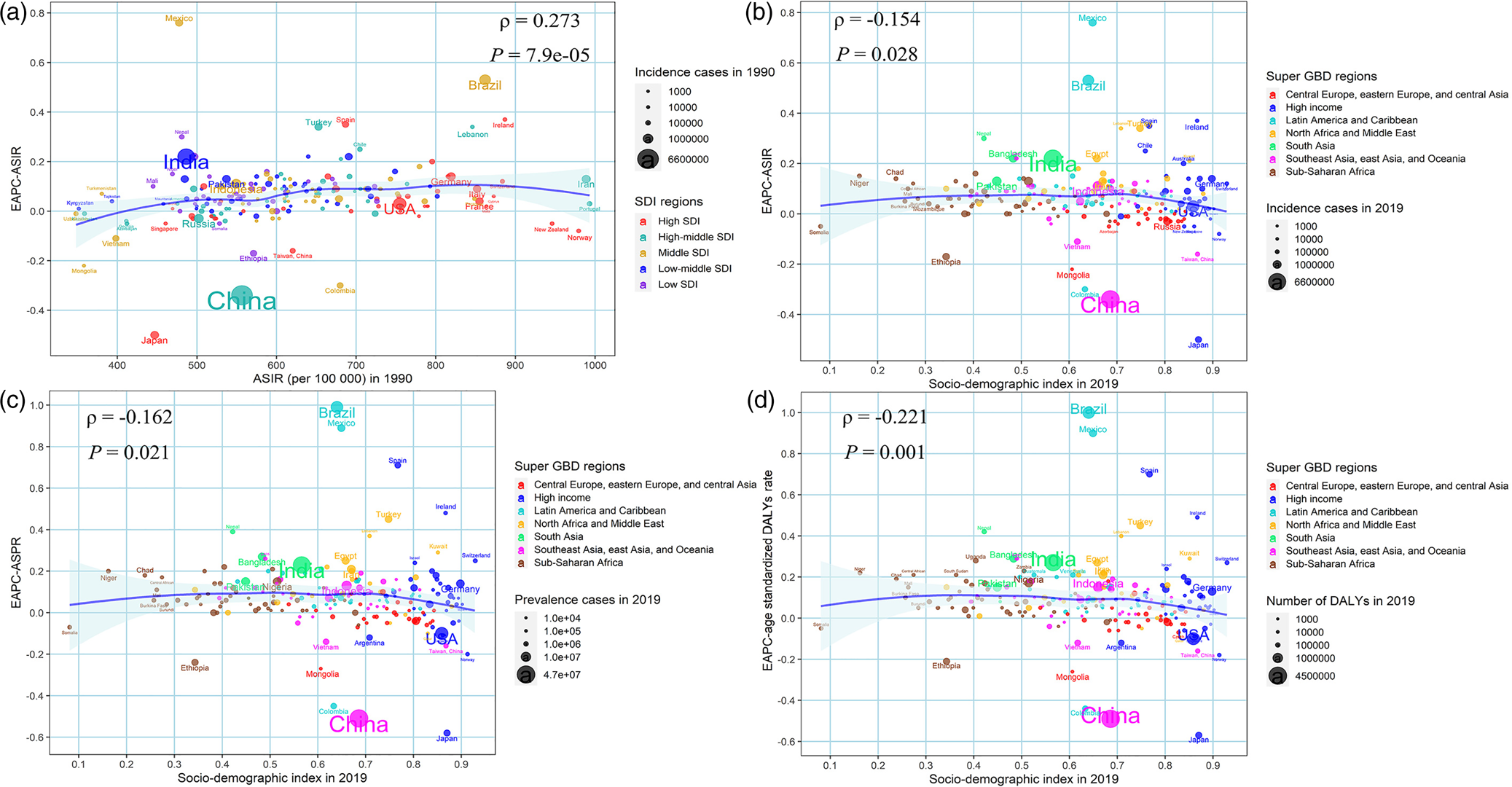 We found that the EAPC of ASIR was positively correlated with baseline ASIR in 1990 (ρ = 0.273, p = 7.9 × 10−5) at the national level (Fig. 4a). Further, we analysed the relationship between SDI in 2019 and EAPC values in ASIR, ASPR, and age-standardised DALYs rate in 204 countries or territories, which presented a negative correlation [ρ of ASIR: −0.154 (p = 0.028), of ASPR: −0.162 (p = 0.021), of age-standardised DALYs rate: −0.221 (p = 0.001)] (Figs 4b–d). Online Supplementary Fig. S5 shows the relationship between ASIR and SDI over time in 21 GBD regions, expressed in the annual time series of 1990 and 2019. Over time, the ASRs in most GBD regions remained relatively stable, except Tropical Latin America, Southern Latin America, high-income Asia Pacific and East Asia presented a climbing trend beforehand and the following decline afterwards in recent years.