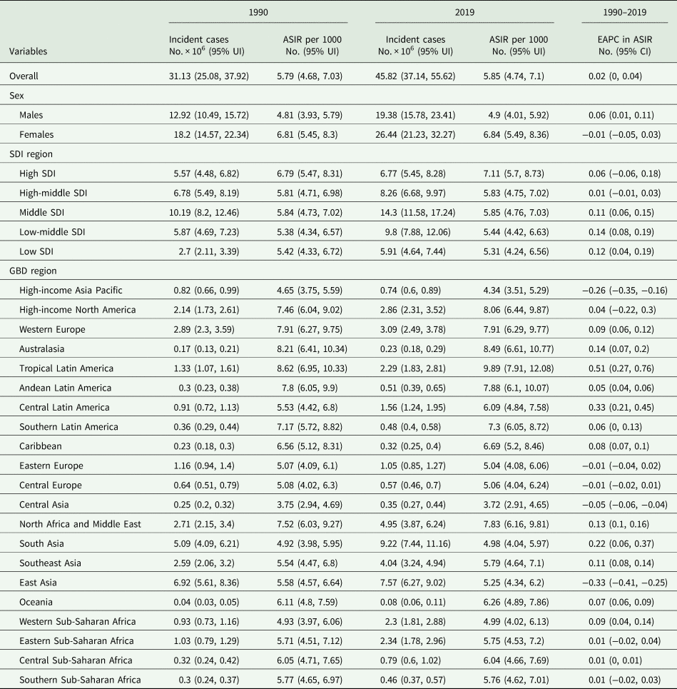 No., number; ASIR, age-standardised incidence rate; UI, uncertainty interval; EAPC, estimated annual percentage change; and CI, confidential interval.