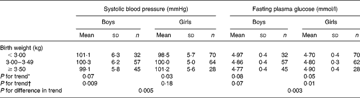 Table 5 Multivariate regression analyses showing the systolic blood pressure and fasting blood glucose of 296 Afro-Jamaican children according to birth weight and sex