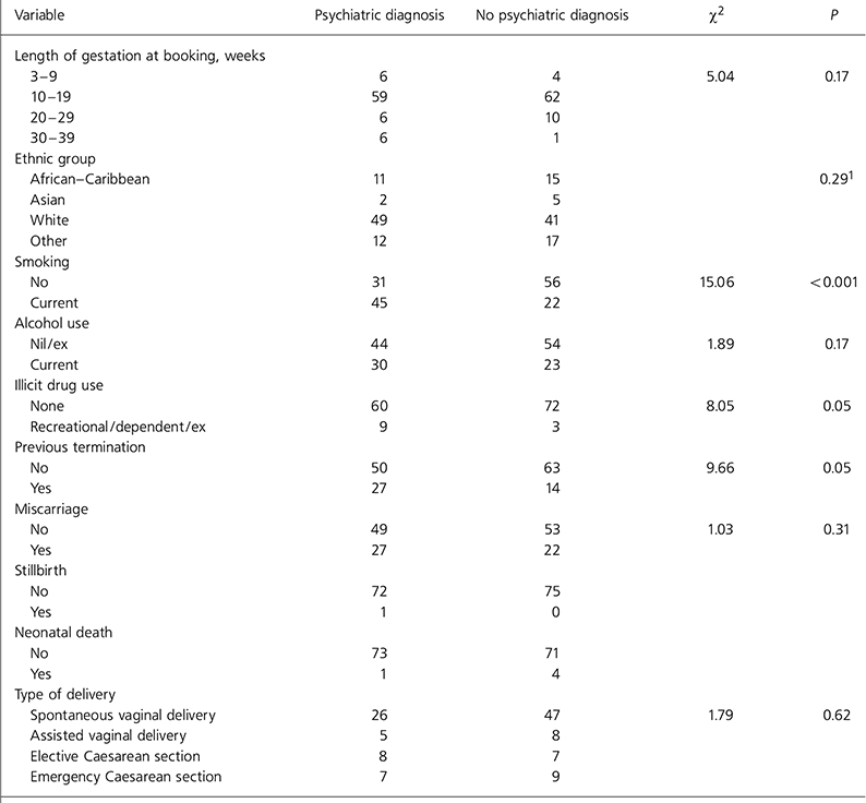 Booking data were recorded for 156 women (mean age 30.1 years, s.d.=6). Psychiatric diagnosis was recorded by midwives and is given in Table 1. The psychotropic medications taken by the women at the time of booking were selective serotonin reuptake inhibitors (n=11, 14.4%), tricyclic antidepressants (n=3, 4.0%), antipsychotic drugs (n=2, 2.6%), mood stabilisers (n=3, 4.0%) and others (n=2, 2.6%). None of the women was taking atypical antipsychotic medication.