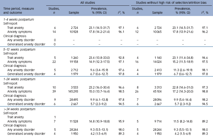 The prevalence of self-reported anxiety symptoms was 17.8% (95% CI 14.2–21.4, 14 studies, n = 10 928) at 1–4 weeks postpartum, 14.9% (95% CI 12.3–17.5, 22 studies, n = 19 158) at 5–12 weeks postpartum, 15.0% (95% CI 13.7–16.4, 39 studies, n = 145 293) at 1–24 weeks postpartum, and 14.8% (95% CI 10.9–18.8, 7 studies, n = 11 528) at >24 weeks postpartum (Table 2 and online Fig. DS3). The prevalence of having a clinical diagnosis of any anxiety disorder was 9.6% (95% CI 3.4–15.9, 5 studies, n = 2712) at 5–12 weeks postpartum, 9.9% (95% CI 6.1–13.8, 9 studies, n = 28 495) at 1–24 weeks postpartum and 9.3% (95% CI 5.5–13.1, 5 studies, n = 28 244) at >24 weeks postpartum (Table 2 and online Fig. DS1). The prevalence of a generalised anxiety disorder was 6.7% (95% CI 0.6–12.7, 4 studies, n = 1979) at 5–12 weeks postpartum, 5.7% (95% CI 2.3–9.2, 6 studies, n = 2667) at 1–24 weeks postpartum, and 4.2% (95% CI 1.5–6.9, 4 studies, n = 1950) at >24 weeks postpartum (Table 2 and online Fig. DS2).