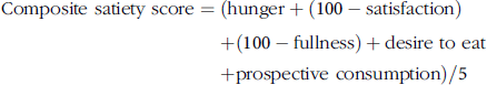 $${\rm{Composite\,\,satiety\ score}} = \left( {{\rm{hunger}} + \left( {100 - {\rm{satisfaction}}} \right) \hskip127pt+ \left( {100 - {\rm{fullness}}} \right) + {\rm{desire\,\,to\,\,eat}} \hskip117pt+ {\rm{prospective\,\,consumption}}} \right)/5$$