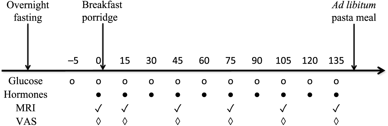 Participants were recruited between August 2016 and April 2017 from the local student and staff population via a poster advertisement. Those who expressed interest were invited to a screening session to establish whether they met the study inclusion criteria, namely age 18–65 years, healthy, BMI ≥18 and ≤24·9 kg/m2, and able to give written informed consent. Exclusion criteria included: using medication which interfered with study measurements, participated in another nutritional or biomedical trial 3 months before this study, not being a habitual breakfast consumer, not usually eating at least three meals a day, not willing to consume all of the foods offered during the study, working night shifts (between midnight and 06.00 hours), doing strenuous exercise for >10 h/week, consuming twenty-one alcoholic drinks in a typical week, following a medically or self-prescribed diet during the 2 weeks prior to and until the end of the present study, contraindications for MRI scanning (e.g. presence of metal implants, an infusion pump and/or a pacemaker) as assessed by a standard MRI safety questionnaire, pregnancy, inability to lie flat, and exceeding the scanner bed weight limit of 120 kg.
