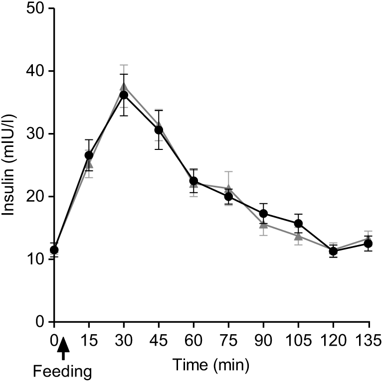 Fasting baseline glucose levels between study arms were not significantly different, as expected. The glucose level rose rapidly after feeding and declined towards baseline level at t = 135 min (Fig. 3). There was no significant difference between the meals in iAUC for glucose (paired t test, P > 0·05), which was the primary outcome of the present study (Table 2).