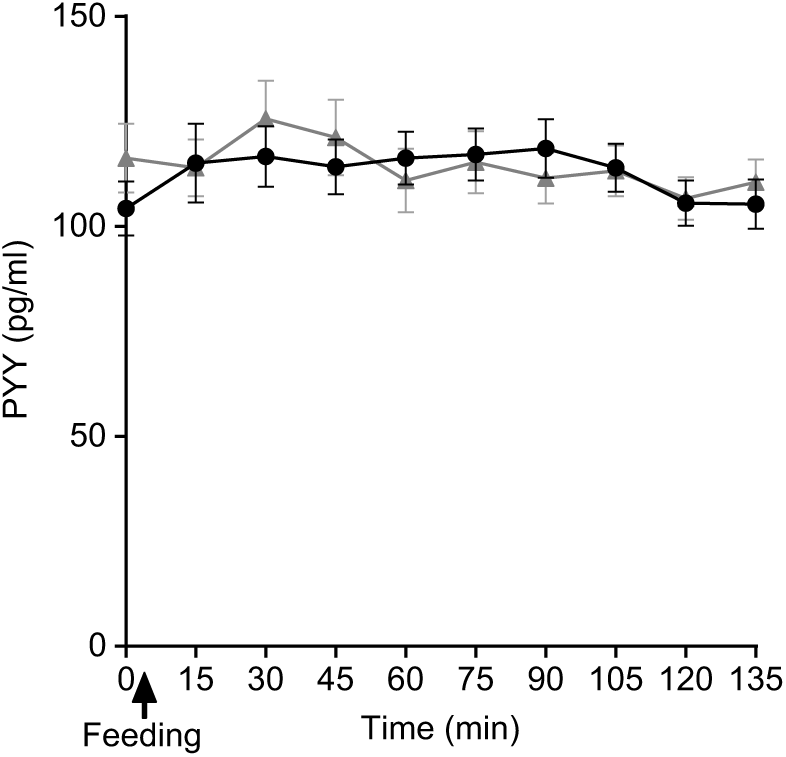 GLP-1 is an incretin hormone released from L cells located in both the small and large intestines in response to food intake(Reference Steinert, Feinle-Bisset and Asarian45). Plasma GLP-1 levels are at their lowest in fasting state (after overnight fast). Plasma levels rise rapidly during meals and usually remain above baseline (morning levels) between meals(Reference Steinert, Feinle-Bisset and Asarian45, Reference Khalaf, Hoad and Menys52). PYY is also secreted from L cells(Reference Moran, Leslie and McLaughlin44). It inhibits gastric motility and increases water and electrolyte absorption in the colon. It has been shown to reduce appetite(Reference Moran, Leslie and McLaughlin44). In the present study, GLP-1 responses were consistent with plasma insulin concentrations, which were comparable following both meals. PYY was not significantly different between the two meals.