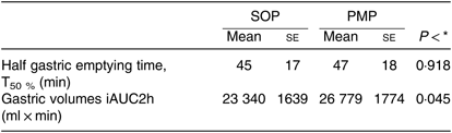 Gastric volumes at baseline (t = 0) for both meals were not significantly different, as expected. These rose immediately after feeding for both meals, and then the volumes declined with time (Fig. 5). The ANOVA showed a significant interaction between factors. Gastric volumes were higher for the PMP breakfast meal at t = 15 min and 45 min (P < 0·05). iAUC for gastric volumes was significantly different between the meals, although both meals were isovolumetric at ingestion (paired t test, P < 0·05). The PMP meal had larger gastric volumes compared with SOP (Table 3). T50 % of SOP and PMP were similar at 47 (sem 4) min and 47 (sem 3) min, respectively (paired t test, P > 0·05).