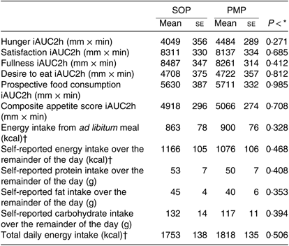 There was no significant difference in energy intakes from ad libitum pasta bake meal following the consumption of PMP and SOP (paired t test, P > 0·05) (Table 4).