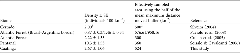 The abundance of prey species is a determining factor for the abundance of large predators (Schaller, Reference Schaller1972; Karanth & Nichols, Reference Karanth and Nichols1998; Karanth et al., Reference Karanth, Nichols, Samba Kumar, Link and Hines2004), with medium- to large-sized mammals being the preferred prey of jaguars (López González & Miller, Reference López González and Miller2002). In the Pantanal high prey availability may be responsible for the high jaguar densities of 6.7 individuals 100 km-2 (Soisalo & Cavalcanti, Reference Soisalo and Cavalcanti2006) compared to other areas in Brazil (Table 2). Semi-arid systems such as caatinga are characterized by a low mean annual precipitation that results in low plant productivity (Davidson, Reference Davidson1977) and herbivore abundance (Chase et al., Reference Chase, Downing and Shurin2000). Medium- to large-sized jaguar prey species in the Orders Perissodactyla and Artiodactyla, such as tapirs Tapirus terrestris, deer Mazama spp. and peccaries Tayassu spp., are scarce in the caatinga, probably because of the low productivity and recent hunting pressure. These species are now only relict populations (Oliveira et al., Reference Oliveira, Gonçalves, Bonvicino, Leal, Tabarelli and Silva2003). In addition, the caatinga is characterized by small-scale subsistence farming with low agricultural production (MMA, 2007). The rural population is poor and poaching is common (Leal et al., Reference Leal, Da Silva, Tabarelli and Lacher2005), providing access both to a protein source and to money from selling excess game (Graffin, Reference Graffin2007). Depletion of the prey base may thus be potentially limiting the jaguar population.