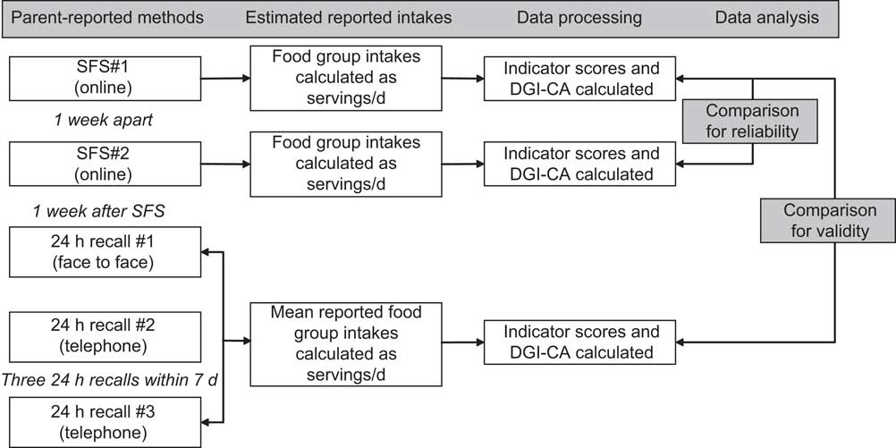 Therefore, the aim of the present study was to explore the reliability and relative validity of the DGI-CA score for young children, derived using parent-reported food intake data from a newly developed Short Food Survey (SFS).