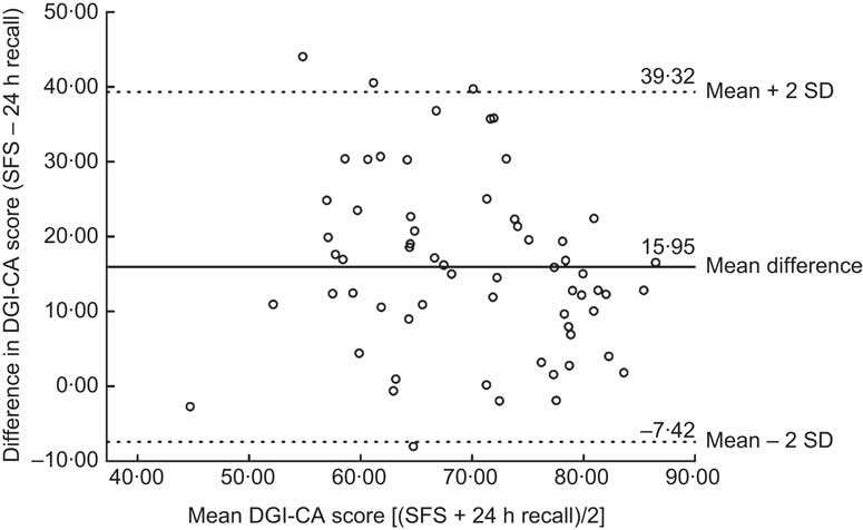 ICC using two-way mixed models were used to establish the association between the methods( Reference Nelson 20 ). Bland–Altman plots were used to determine the agreement between absolute values from each method( Reference Bland and Altmann 21 ). Bland–Altman plots were generated for all food group indicators, but only the overall DGI-CA plot is presented. Mean differences and limits of agreement (±2 sd) were calculated( Reference Bland and Altmann 21 ), with positive values suggesting the SFS overestimated the indicator score relative to the 24 h recalls. Mean differences indicate how well the SFS and 24 h recall agree at the study sample level. For each indicator, whether agreement between the methods was constant across the range of intakes was examined. Linear regression analysis was performed for each indicator (the regression of the average of the two methods v. their difference) to test if the slope of the mean bias was significantly different from zero( Reference Bland and Altmann 21 ). A result different from zero suggests the bias is proportional, or varying across the range of indicator scores.