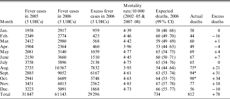 The increase in the number of fever cases reported started in May 2006. It peaked during August–October, and began tailing off in November and December of that year. The number of expected deaths for the year 2006 based on the average mortality rates observed for 2002–2005 and 2007–2008 was 734, whereas the number of observed deaths was 812, resulting in 78 excess deaths during 2006. The actual deaths observed during August–October 2006 exceeded the 99% CI of expected deaths based on the average mortality rates for 2002–2005 and 2007–2008 (Table 1).