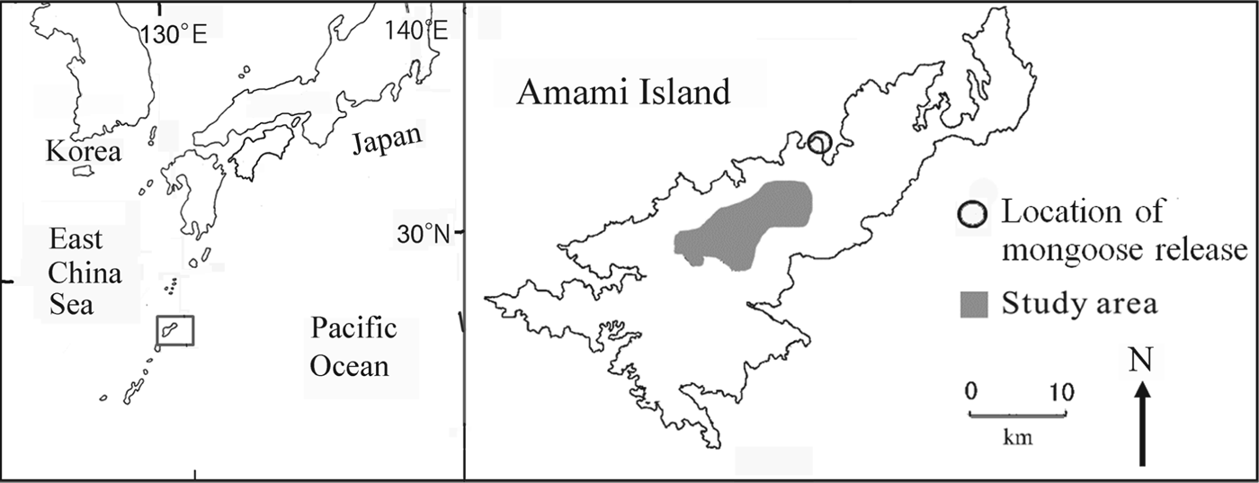 Amami Island (719 km2) is the seventh largest island in Japan (Fig. 1) and 85% of its land area is forested. The Island is home to a large number of endemic species as a result of its separation from mainland Japan and Taiwan 10–1.5 million years ago, long before the other islands of Japan were separated from the continent (Otsuka & Takahashi, Reference Otsuka and Takahashi2000; Sugimura et al., Reference Sugimura, Yamada and Miyamoto2003).