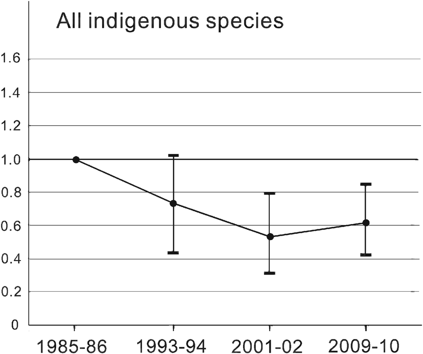 Fig. 2 The Living Planet Index for 23 indigenous species (i.e. all species except Herpestes auropunctatus and Rattus rattus) on Amami Island (Fig. 1), indicating the population level relative to that of 1985–1986. Values < 1.0 indicate that the population was below the 1985–1986 level. The vertical bars indicate the 95% confidence interval from bootstrapping.