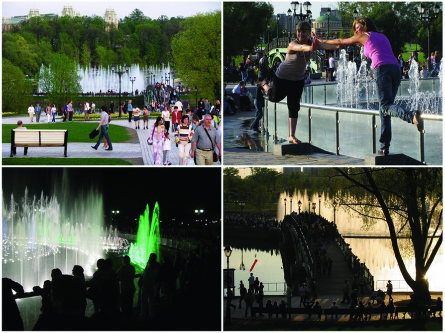 It seems possible to discuss Tsaritsyno as an entertainment facility, or attraction, in two ways: in terms of changes made to the material environment and in terms of radically changing practices and new configurations to be made of this space by new visitors. Of course, these two aspects are complementary and mutually reinforcing. Perhaps the most striking example of a new object-attraction installed in Tsaritsyno during the renovation is the huge light-and-music fountain in the middle of a once peaceful pond. The fountain is 55 metres in diameter, with a jet height of up to 15 metres. Its baroque exuberance is directly proportional to the contestability of its very presence in a landscape park from a historical point of view (see Figure 5). This technological facility was built on a small island in the Middle Tsaritsyno Pond on the personal order of Mayor Yuri Luzhkov, who had a soft spot for city fountains. To that end, the island was expanded, strengthened and equipped with two modern bridges, benches and loudspeakers for music. Neither the idea itself, nor the appearance, nor the use of the fountain which has become a sort of ‘central square’ of the ‘boulevard’ down which visitors walk from the entrance gate to the Grand Palace, remind us of the old ‘romantic’ Tsaritsyno. The space around the fountain is one of the busiest spots in the park.