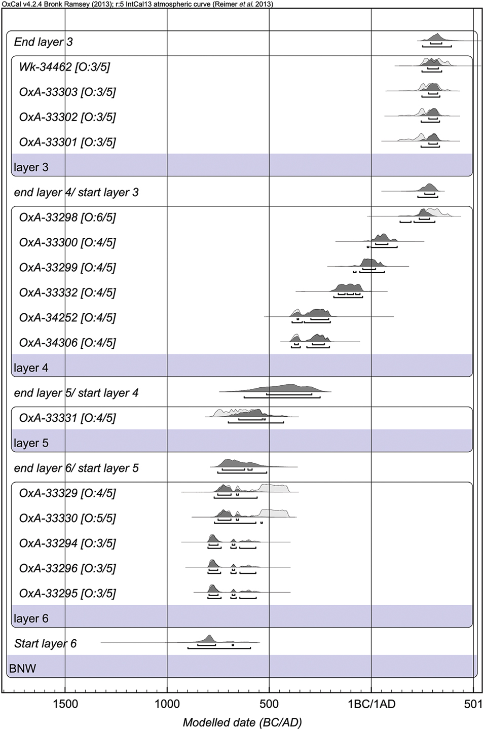 AMS radiocarbon dating was carried out at the Oxford Radiocarbon Accelerator Unit (ORAU). Four samples failed to produce results due to low yields after chemical pre-treatment, so in the majority of cases, a variation on the routine method was used, and a less robust pre-treatment method was applied (ORAU code ‘RR’; see Brock et al. Reference Brock, Higham, Ditchfield and Bronk Ramsey2010). This comprised a demineralisation with 1M HCl (1hr), a 15-minute ultrasonication in fresh 1M HCl, rinsing in ultrapure water (4 times) before a final ultrasonication, again in fresh ultrapure water for 5 minutes (×6 or until the water remained clear). The samples were then acidified for a further 5 minutes in 1M HCl and rinsed twice with ultrapure water. Some samples (larger or less fragile seeds) were dated using the routine ‘ZR’ method, which includes a base wash designed to mobilise humates (Brock et al. Reference Brock, Higham, Ditchfield and Bronk Ramsey2010). Following pre-treatment, samples were then dried and weighed in a pre-cleaned tin capsule, and combusted in a CF-IRMS system, consisting of a CHN elemental analyser (Carlo-Erba NA 2000) coupled to a gas-source isotope ratio mass spectrometer (Sercon 20/20). Purified CO2 from the combustion was converted to graphite using established protocols (Dee & Bronk Ramsey Reference Dee and Bronk Ramsey2000) and AMS dated in the Oxford HVEE accelerator mass spectrometer. Fourteen samples were dated (Table S3). The results were analysed using a Bayesian statistical modelling approach in OxCal 4.2 (Bronk Ramsey Reference Bronk Ramsey2009). The results closely match those previously obtained for BNW from charcoal and freshwater bivalve shells (Higham & Higham Reference Higham and Higham2009), as summarised in Figure 2.