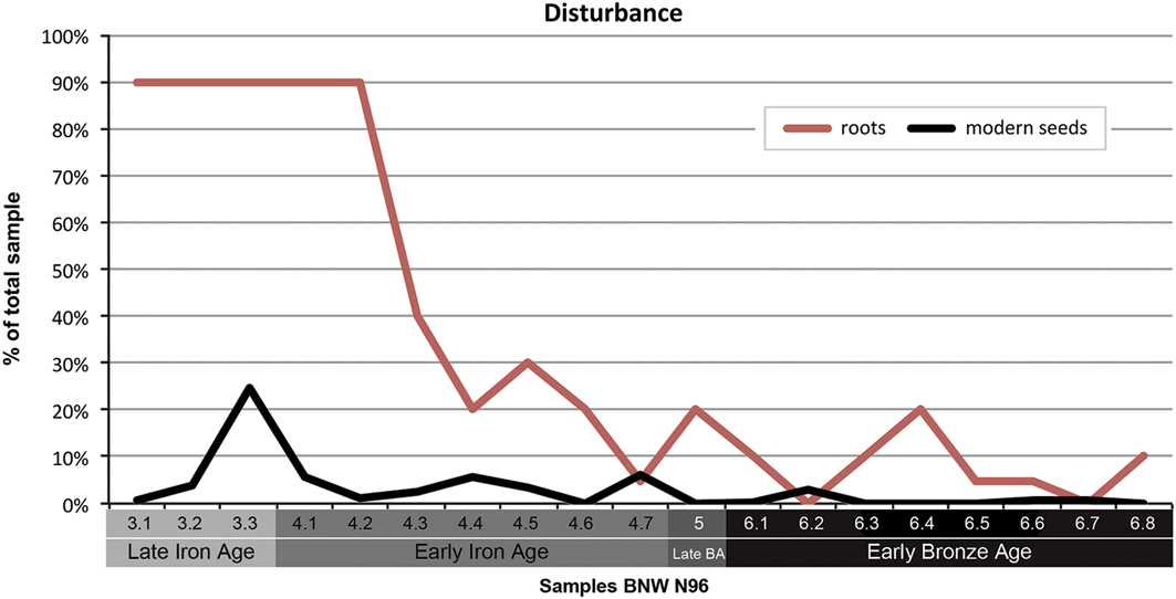 Figure 4 Graph plotting the estimated percentages of roots and modern specimens identified in samples from BNW N96.