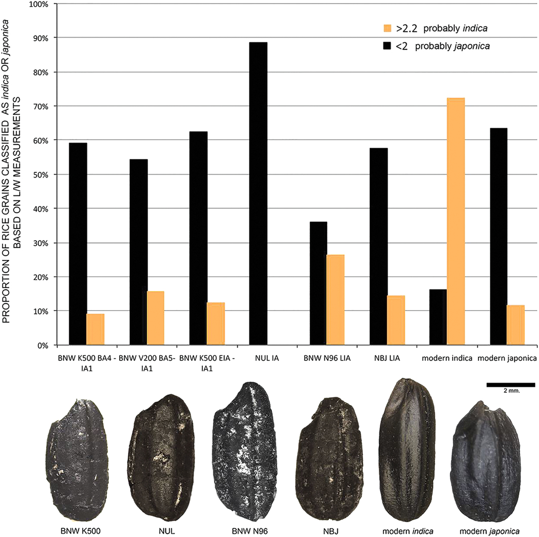 Figure 6 Proportions of archaeological (BNW, NUL and NBJ) and modern rice grains classified as indica or japonica according to length/width ratio. Ratios <2 are probably japonica, whereas those >2.2 are probably indica. Charred specimens are shown below; details on the morphometric analysis can be found in Castillo et al. (Reference Castillo, Tanaka, Sato, Ishikawa, Bellina, Higham, Chang, Mohanty, Kajale and Fuller2016b).