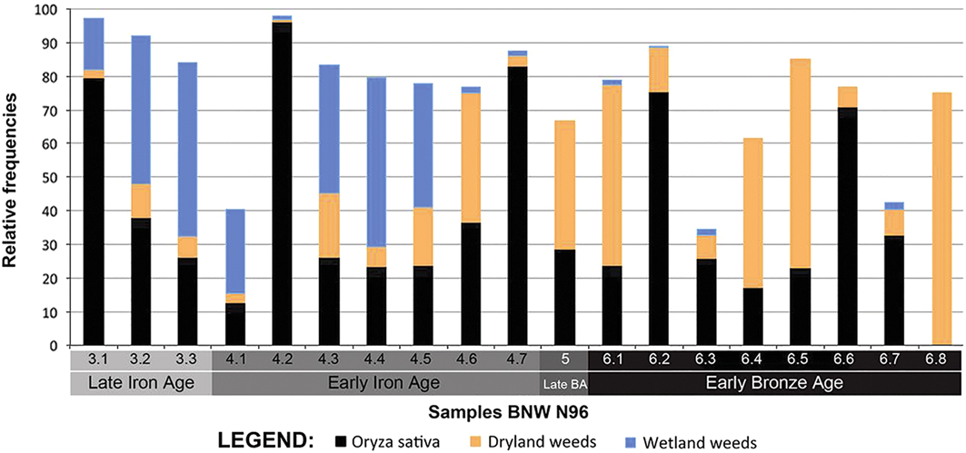 The results from BNW (including N96 and two other trenches K500 and V200), along with those from Late Iron Age NBJ, indicate a shift from dry to wet rice cultivation. Dryland weeds dominate the Early and Late Bronze Age contexts (Figures 7–8A). In the Early Iron Age, the proportion of dryland weeds decreases considerably, and weed types of an indeterminate (wet/dry) ecology are noted. In the Late Iron Age (layer 3 in BNW N96), wetland weeds dominate.