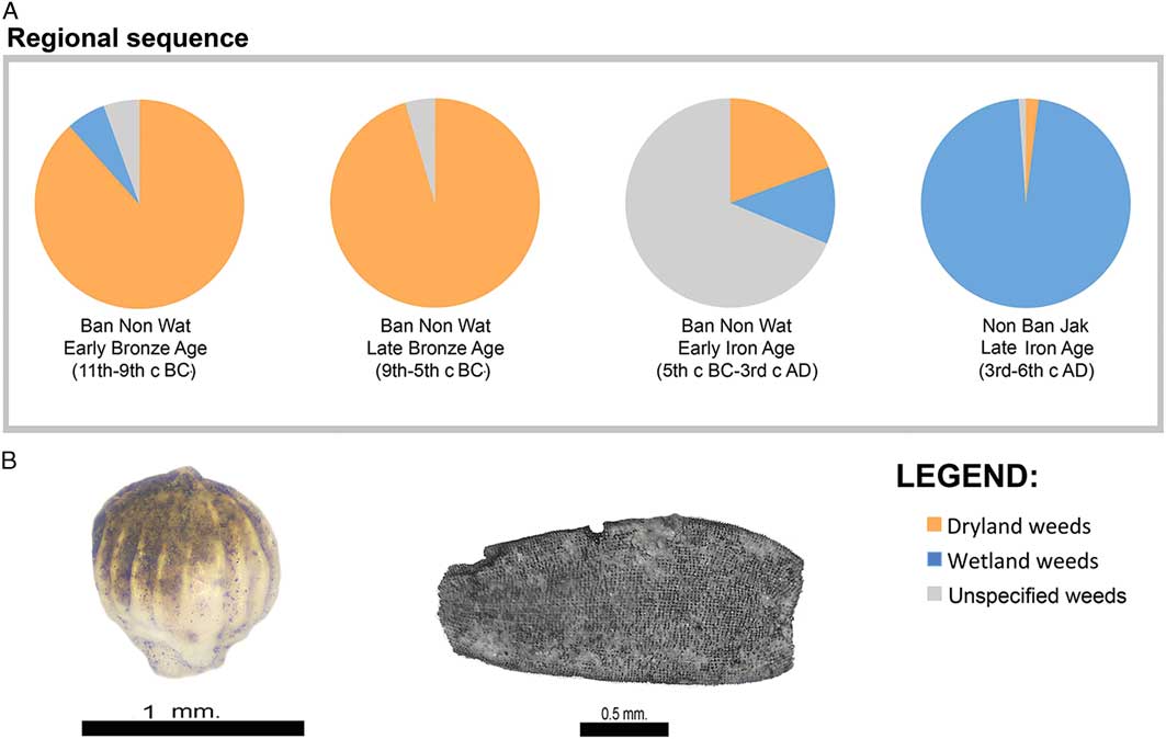 Our analysis suggests that wetland rice cultivation was practised at BNW from the Early Iron Age (in the first millennium AD) and almost exclusively in the Late Iron Age. Yet there are traces of dryland weeds at BNW that may imply some fields were still dry farmed alongside irrigated fields in the Early Iron Age. On the other hand, at NBJ, which was occupied only during the Late Iron Age, it appears to have been fully engaged in systems of wetland cultivation. A. paniculata, the most prominent dryland weed consistently found at Mainland Southeast Asian sites that practise dryland cultivation, was absent from all 23 of the samples analysed from the site, with green algae the dominant weed. Samples from NBJ extend into a later period than those from BNW, meaning that wetland cultivation may have been practised for several centuries, by which time dryland farming systems had been abandoned. NBJ probably corresponds to a later stage of more intensive wetland agriculture that started in the region around the time of the Early Iron Age, and which progressively became the dominant agricultural regime in the Mun River Valley by the Late Iron Age, producing higher rice yields and greater surpluses as a result.