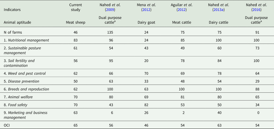 For the studies conducted in Chiapas (Mexico) with meat-purpose or dual-purpose ruminants (Nahed et al., Reference Nahed, Calderón, Aguilar, Sánchez-Muñoz, Ruiz-Rojas, Mena, Castel, Ruiz, Jiménez-F, López-Méndez, Sánchez-Moreno and Salvatierra2009, Reference Nahed, Grande, Aguilar and Sánchez2016; Aguilar et al., Reference Aguilar, Nahed, Parra, García and Ferguson2012), the OCI values were lower than in the current study (around 55%), but the climatic and productive conditions which are very different from those considered here should be taken into account. For Nutritional management, Soil fertility and contamination and Breeds and reproduction, higher values were observed than in this study, whereas Food safety and moreover, Marketing and business management, had lower values.