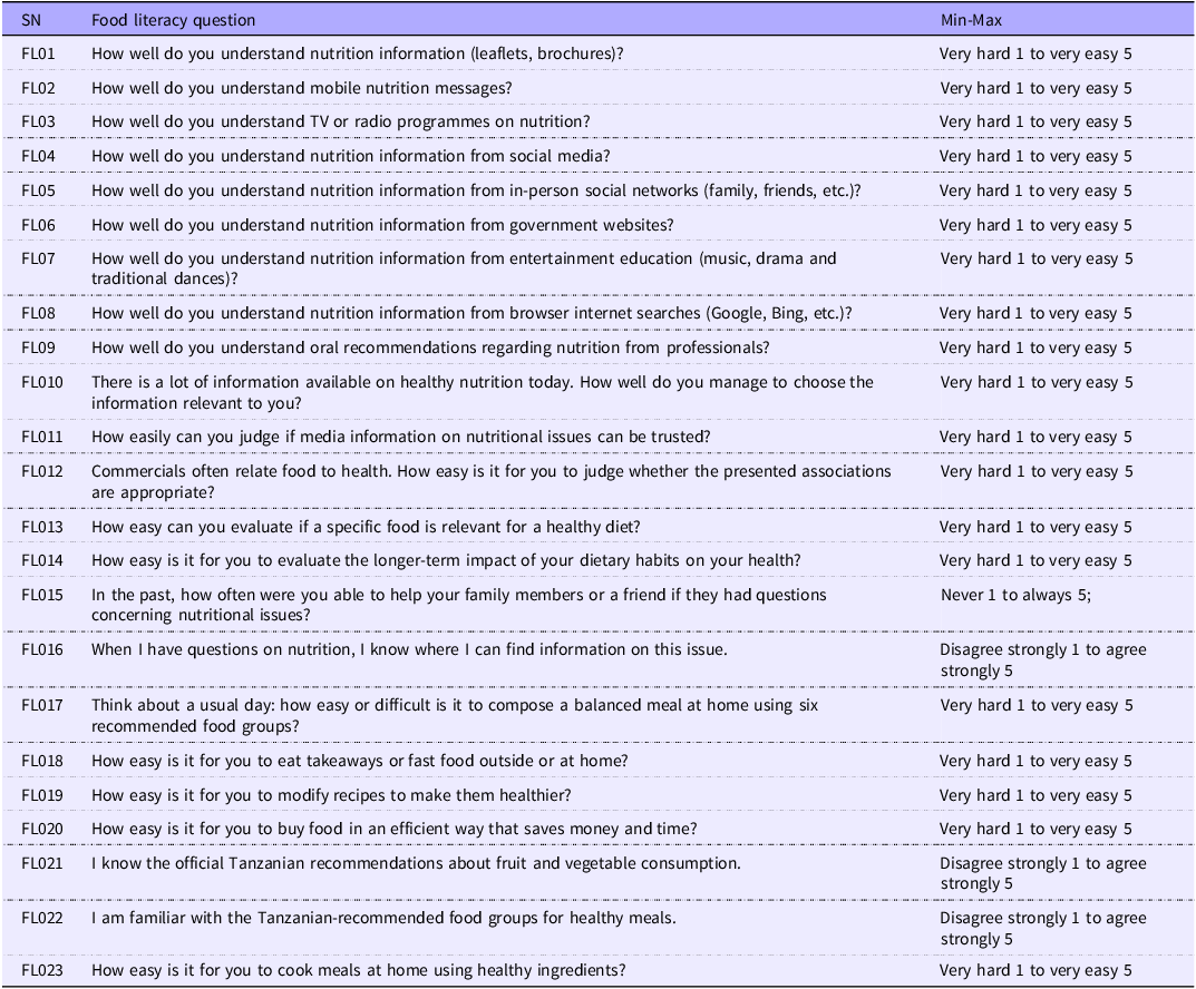 The literature review primarily identified questions regarding food and nutrition information, as well as healthy eating, outlined in various reviewed studies(Reference Gréa Krause, Beer-Borst and Sommerhalder17,Reference Park, Park and Park33,Reference So, Park and Choi34) . Fifteen publications were retrieved and evaluated for purpose, scope, face validity, content validity, construct validity and reliability for adoption. Adjustments regarding food groups and recommended portions for fruit and vegetable consumption were made as outlined in the Tanzania food-based dietary guidelines to ensure the final tool comprehensively addresses food literacy that suits the Tanzanian context. Table 1 presents the initial pre-designed food literacy tool, which consists of twenty-three questions in a single factor.