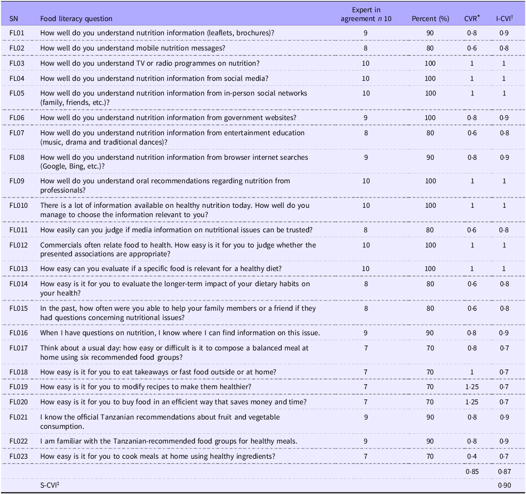 A panel of nutrition, food and health promotion experts (n 10) evaluated the necessity of the questions and the degree to which the questions contribute to the tool’s purpose. The selected ten experts fall within the acceptable range recommended for the content validation process(Reference Almanasreh, Moles and Chen20). Subject matter expertise is essential in the content validation process(Reference Madadizadeh and Bahariniya21); hence, this study randomly selected experts based on their expertise in implementing national and subnational nutrition activities, being members of the Scaling Up Nutrition platform with assigned roles in implementing the second National Multisectoral Nutrition Action Plan II(6). The experts were from the Ministry of Health (n 2); the President’s Office – Regional Administration and Local Government, Tanzania (n 1); and research institutions represented by the Tanzania Food and Nutrition Centre (n 2). Additional experts were from Regional and District Administrative Secretariats (n 2); academic institutions, including Sokoine University of Agriculture (n 1) and the Nelson Mandela African Institution of Science and Technology (n 1); and UN agencies (n 1). The online semi-structured questionnaire was sent to these experts, who evaluated every question by answering each food literacy question to determine its necessity and relevance for measuring food literacy among adults in Tanzania. Using the information provided by the subject matter experts, the calculation of the content validity ratio (CVR), content validity index (CVI), scale validity index (S-CVI) and experts in agreement was done to ensure that only accepted questions remain in the tool.