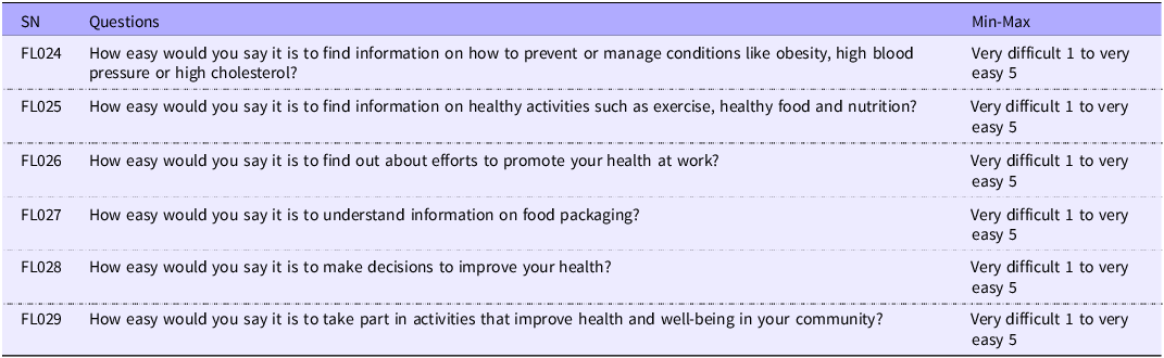 Table 2 shows the results for expert agreements, CVR, I-CVI and S-CVI. More than half of the experts agreed that the questions were necessary to measure food literacy. The CVR from this study was 0·85, the S-CVI was 0·9 and the I-CVI ranged from 0·7 to 1·0, all within acceptable limits. Although the pre-designed food literacy tool met acceptable content validity standards, experts suggested including questions about understanding food labels, efforts to prevent NCD, lifestyle behaviours and health-related decision-making. Six questions presented in Table 3 were adapted from a validated health literacy questionnaire and incorporated into the pre-designed tool for further construct validity and reliability analysis of twenty-nine questions.