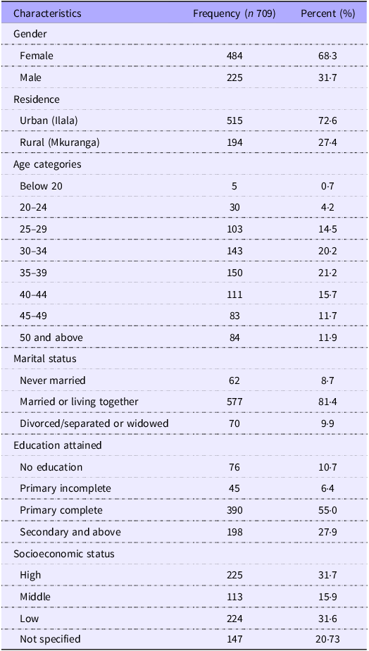 The participants were included if they were 18 years or older, representing one male and/or female residing in the same household as the selected child. Hence, of the 714 adults interviewed, five participants were excluded because either another male or female adult in the same household had been interviewed or was under 18 years of age. Therefore, the analysis involved 709 participants (484 females and 225 males). Among these, 495 were from the Ilala district, and 194 were from the Mkuranga district. The sample size allocation in each study site was proportional to the area’s population size. The total sample size met the recommended guideline for factor analysis(Reference Baharum, Ismail and Awang25).