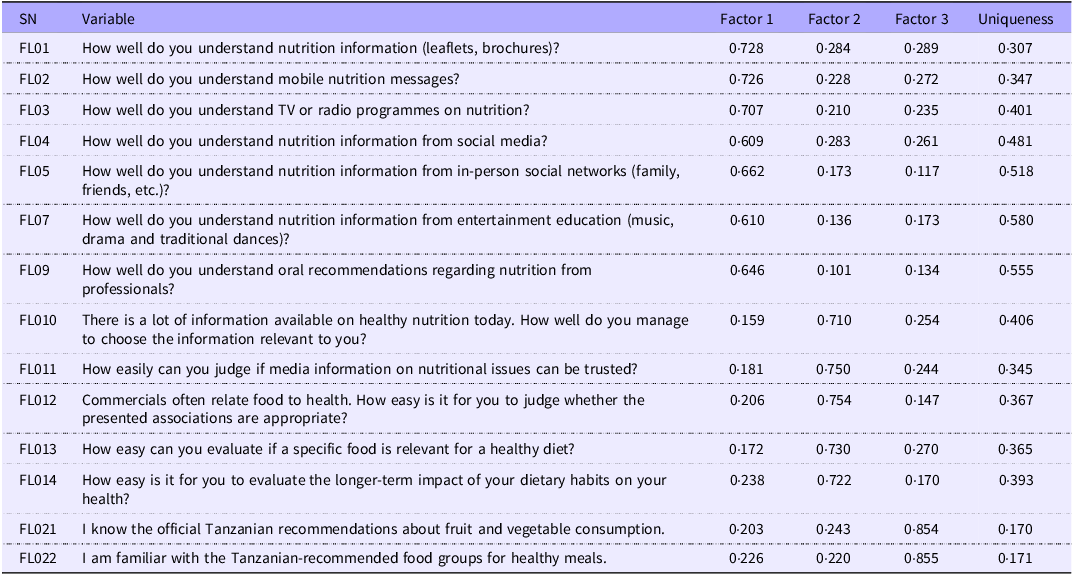 This study utilised most of the questions from the Short Food Literacy Questionnaire, a validated instrument for Swiss adults introduced by Gréa Krause et al. (Reference Gréa Krause, Beer-Borst and Sommerhalder17), which initially consisted of a single factor. However, during exploratory factor analysis, the questions were arranged into three-factor components: understanding nutrition information, applying nutrition information and healthy eating. The naming of the constructs considered the domains of food literacy derived from Nutbeam’s model of health literacy, which distinguishes functional, interactive and critical literacy(Reference Nutbeam35). Specifically, ‘understanding nutrition information’ corresponds to functional literacy, reflecting basic comprehension of food and nutrition information; ‘apply’ aligns with interactive literacy, encompassing the skills to use information in daily activities; and ‘health eating’ integrates elements of both interactive and critical literacy by capturing the ability to make informed choices and engage in health-promoting eating behaviours(Reference Gréa Krause, Beer-Borst and Sommerhalder17,Reference Velardo40) . This domain-specific placement of questions may reflect cultural, educational or dietary differences that shape how individuals understand and apply food literacy, underscoring the need for localised validation instead of assuming a universal structure. The results are consistent with Zwierczyk et al. (Reference Zwierczyk, Kobryn and Duplaga41), who found a three-factor structure: ‘information accessing’, ‘knowledge’ and ‘information appraisal’ when validating the Swiss Short Food Literacy Questionnaire for Poland’s adult population. Contrary to the current findings, Durmus et al. (Reference Durmus, Gökler and Havlio42) confirmed the unidimensional structure for the Turkish Short Food Literacy Questionnaire, as identified by Gréa Krause et al. (Reference Gréa Krause, Beer-Borst and Sommerhalder17). Additionally, some questions from the original Swiss Short Food Literacy Questionnaire(Reference Gréa Krause, Beer-Borst and Sommerhalder17) did not meet the validity criteria in the present study due to contextual irrelevance and cultural differences. This highlights the significance of validating food literacy tools to ensure their relevance, accuracy and effectiveness for specific populations.