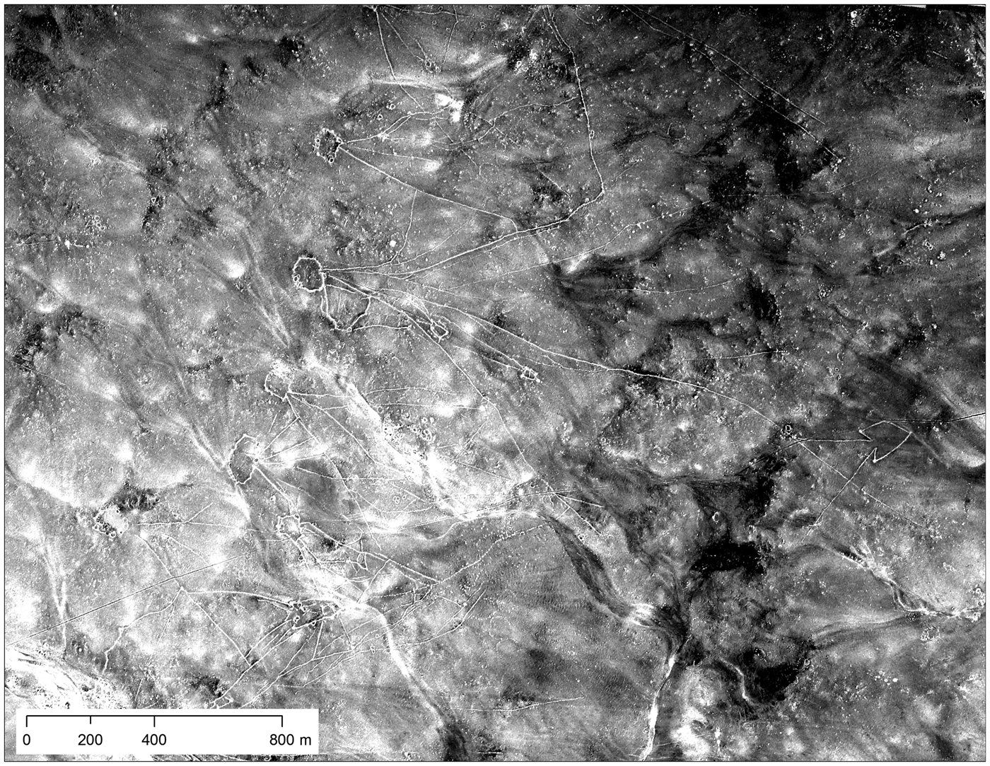 FIGURE 12. Chains of desert kites as visible in U2 imagery from mission 1554, January 30, 1960 (Roll 14L, Frame 1783). Web map version at https://arcg.is/0jreeP.