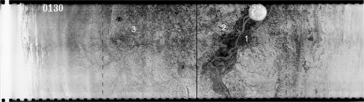 Depending on the height of the lens above the light table, the full extent of each negative on the 9.5-inch U2 film strips could be captured in 3–6 partial images with this camera setup. It is possible to capture the entire negative with a 50 mm macro lens, but at the cost of some film resolution. We use Adobe Photoshop to invert the images and covert them to grayscale TIF format and then to reconstruct each negative (Photomerge). TIFs of full negatives were georeferenced in ArcGIS using ESRI's imagery base map data and sometimes with reference to georeferenced CORONA satellite imagery, which was acquired a decade after the U2 missions. Mosaicking in Adobe Photoshop introduces some geometric distortions, but in our experience, the small amount of spatial error is offset by the considerable time savings of georeferencing by full U2 negative rather than by the individual image (3–6 per U2 frame). Following effective photography and georeferencing, the spatial resolution of the reconstructed U2 negatives varies but can be as high as 0.4 m/pixel in vertical frames.