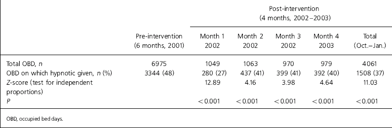 In the post-intervention audit, of the 32 discharges from the wards over a 4-month period, 2 of the patients were on hypnotics prior to admission. There was a significant reduction in the number of patients discharged on a hypnotic that had been started during hospitalisation in the post-audit period (3 of 30, 10% χ2=2.826, P<0.001).