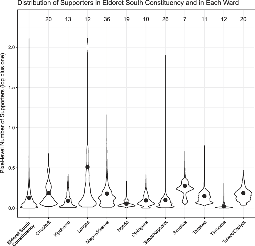 To illustrate the potential pitfalls of aggregating to the sub-constituency unit level in our setting, consider Figure 2, which shows violin plots of (log plus one of) the pixel-level distribution of supporters in Eldoret South Constituency and in each of the constituency’s 11 wards. The distribution of supporters varies widely across the constituency, and both across and within most wards. In Timboroa ward (second from the right), very few people voted for the incumbent MP (the mean level of support, given by the black dot, is near zero) and the MP’s level of support varies little across different parts of the ward (nearly all the mass of the distribution is very close to the mean). In such a context, aggregating to the level of the ward would not result in a large loss of information. However, in Langas ward (fourth from the left), as in the constituency as a whole (leftmost plot), the level of support for the incumbent varies considerably across space. In some parts of the ward, very few people supported the MP in 2002. But in other parts of the ward, they supported him strongly. In this case, aggregating to the ward level (which would involve taking the mean level of support for the incumbent, depicted by the black dot, and assigning it to every pixel in the ward) would be quite misleading. It would imply that an MP seeking to locate projects close to his supporters would be equally likely to locate projects at every point in the ward when, in fact, he would be much more likely to place projects in some places than others. In settings like Langas (and most of the wards in Eldoret South look more like Langas than like Timboroa), aggregation to the ward level obfuscates precisely the allocation problem that we are interested in examining: how MPs target projects at the local level.