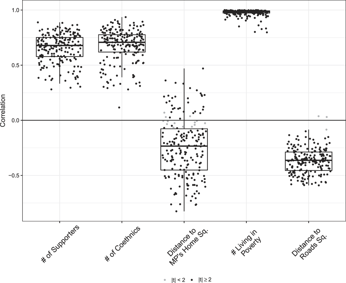 These strong correlations are clearly demonstrated in Figure 4, which plots the grid square-level correlation in each constituency between the log of population density and each of our main explanatory variables, with correlations where |t| ≥ 2 plotted as black points. Footnote 25 As is standard, the interquartile range of the distribution and the median are indicated by the box and the dark horizontal bar that bisects it, respectively. The strong positive correlations between population density and the number of supporters, number of coethnics, and number of people living in poverty stem from the fact that one cannot have supporters, coethnics or people living in poverty where there are no people (and, in the case of the number of people living in poverty, from the fact that the majority of people in Kenya are poor). The correlation with distance to roads has a slightly different source: the endogenous location of roads where people live and the tendency of people to locate themselves close to transport. Given these strong relationships, it becomes difficult to separate out the effect of each variable from the effect of population density.