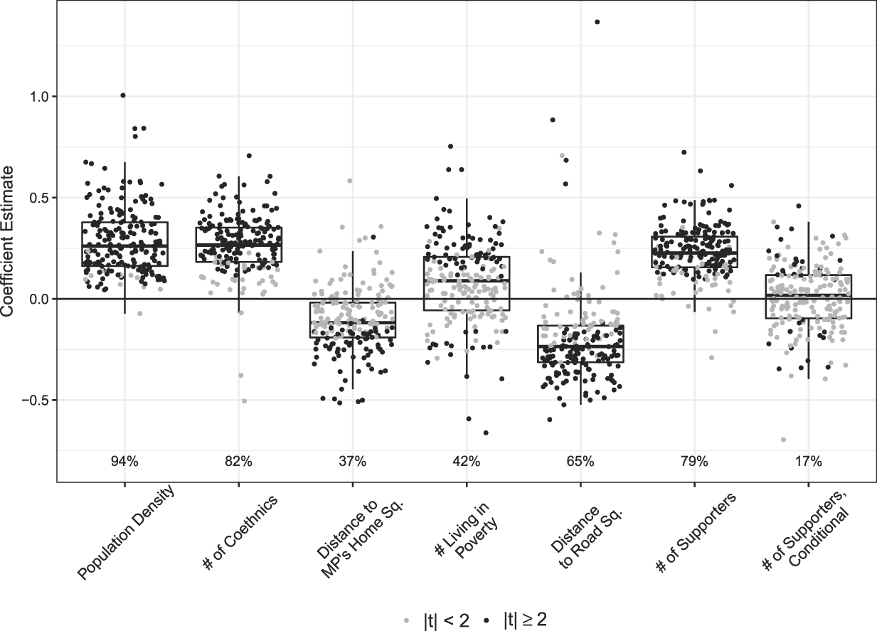 Note: Each dot represents a constituency-level coefficient estimate, with coefficients that are statistically different from zero (with a t-statistic greater than two) plotted in black and those not significantly different from zero plotted in gray. The left-most boxplot shows the bivariate relationship between population density and project placement. The next five present the relationships between the residualized version of the listed covariates and project placement. The right-most boxplot shows the relationship between the residualized number of supports and project placement, conditional on the covariates in columns 1–5. The percentages at the bottom of the figure report the percentage of constituency-level coefficients that are significant in each boxplot.