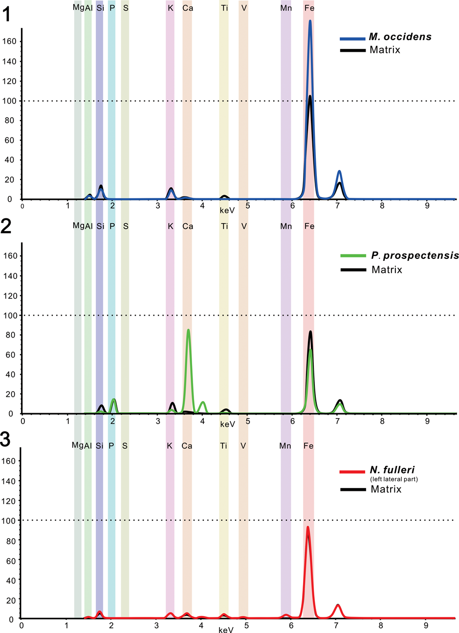 Figure 10. Mean μ-XRF spectra and main elemental contributions from specimens of: (1) Mickwitzia occidens Walcott, Reference Walcott1908 (UCR 10/8/1); (2) Paterina prospectensis (Walcott, Reference Walcott1884) (UCR 10/2006); (3) left lateral part of Nisusia fulleri Mount, Reference Mount1981 (UCR 10/2031).